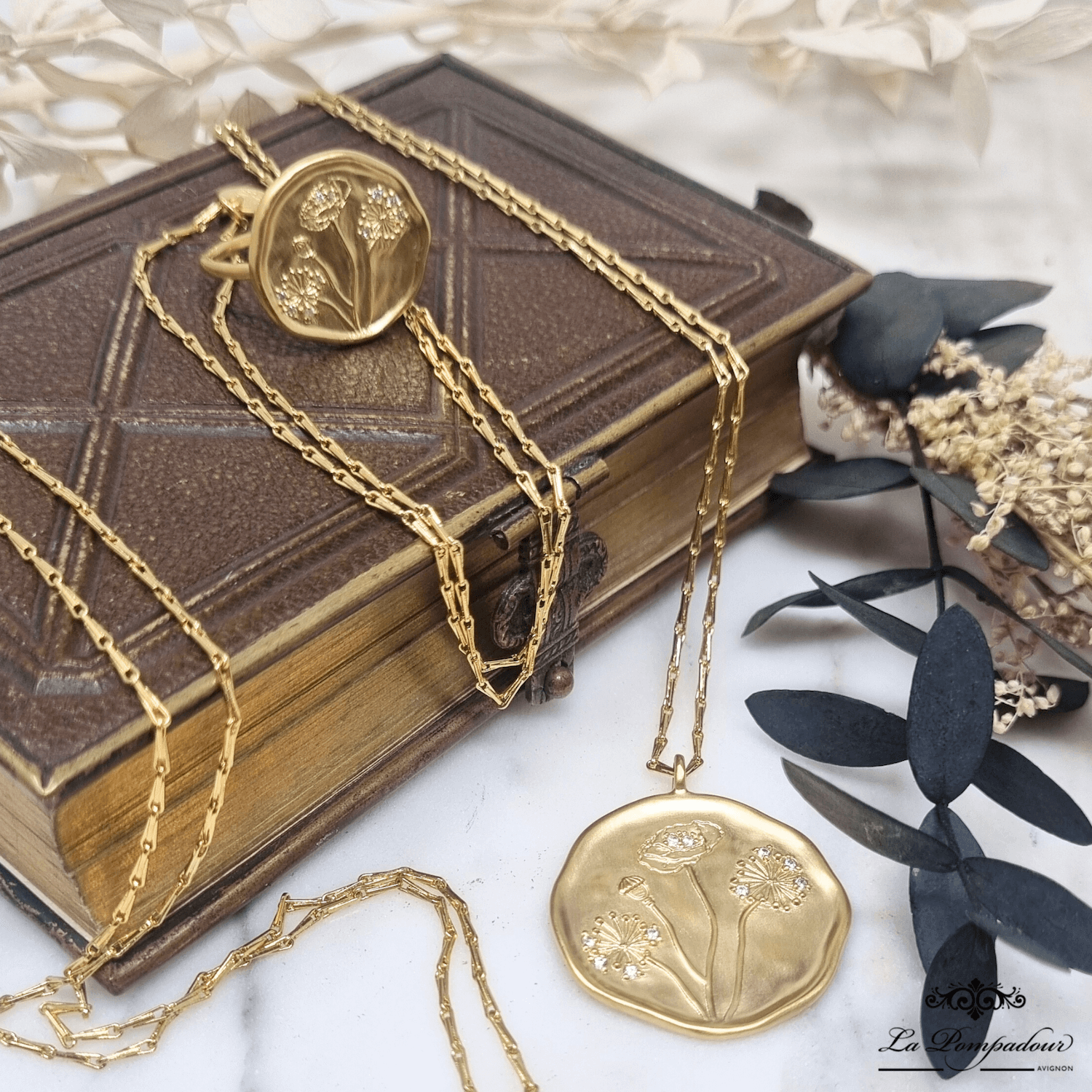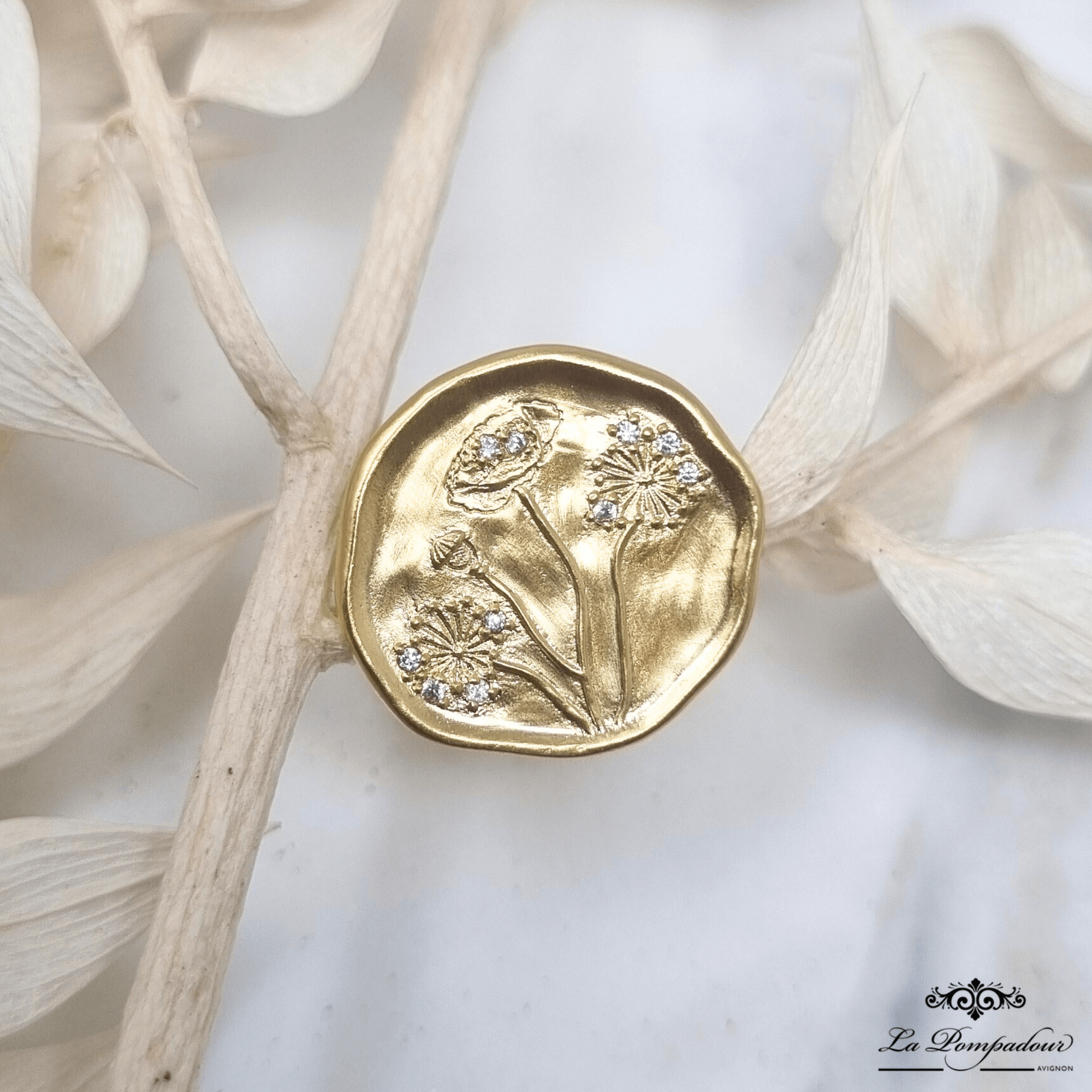 Médaille décorée de deux fleurs de pissenlit et un coquelicot. Les fleurs sont ornées de dix zircons blancs sertis qui ajoutent cet éclat comme une rosée matinale. Une bague au charme élégant, poétique et intemporel