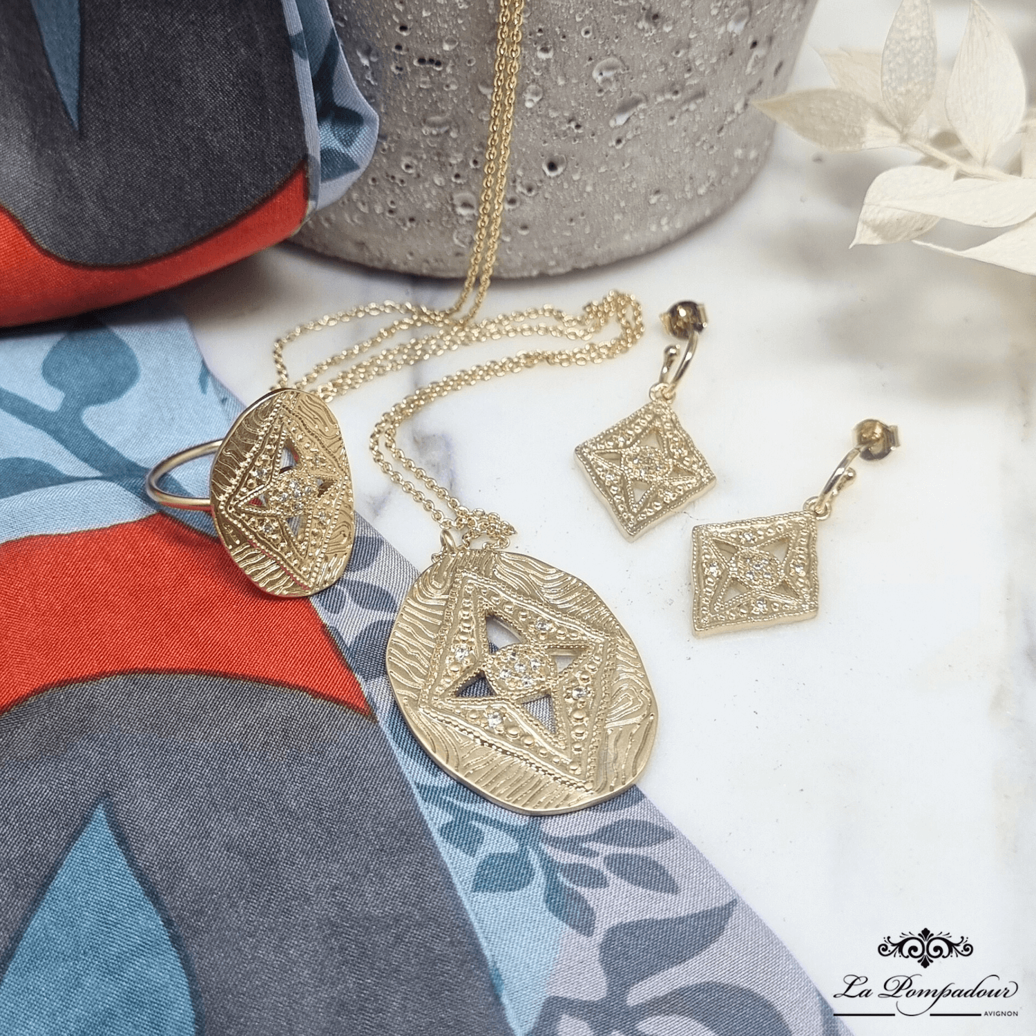 Les boucles d’oreilles jouent avec la lumière et la peau grâce à ses parties ajourées, comme si le vent l’avait sculptée. Les quatre directions cardinales et le cœur sont sertis de zircons, un guide pour celles en quête de sens ou de chemin. Les vagues gravées évoquent le souffle du vent et le roulis des marées. Cette boucles expriment le mouvement, l’intuition, la liberté d’errer pour trouver son chemin, mais sans jamais se perdre