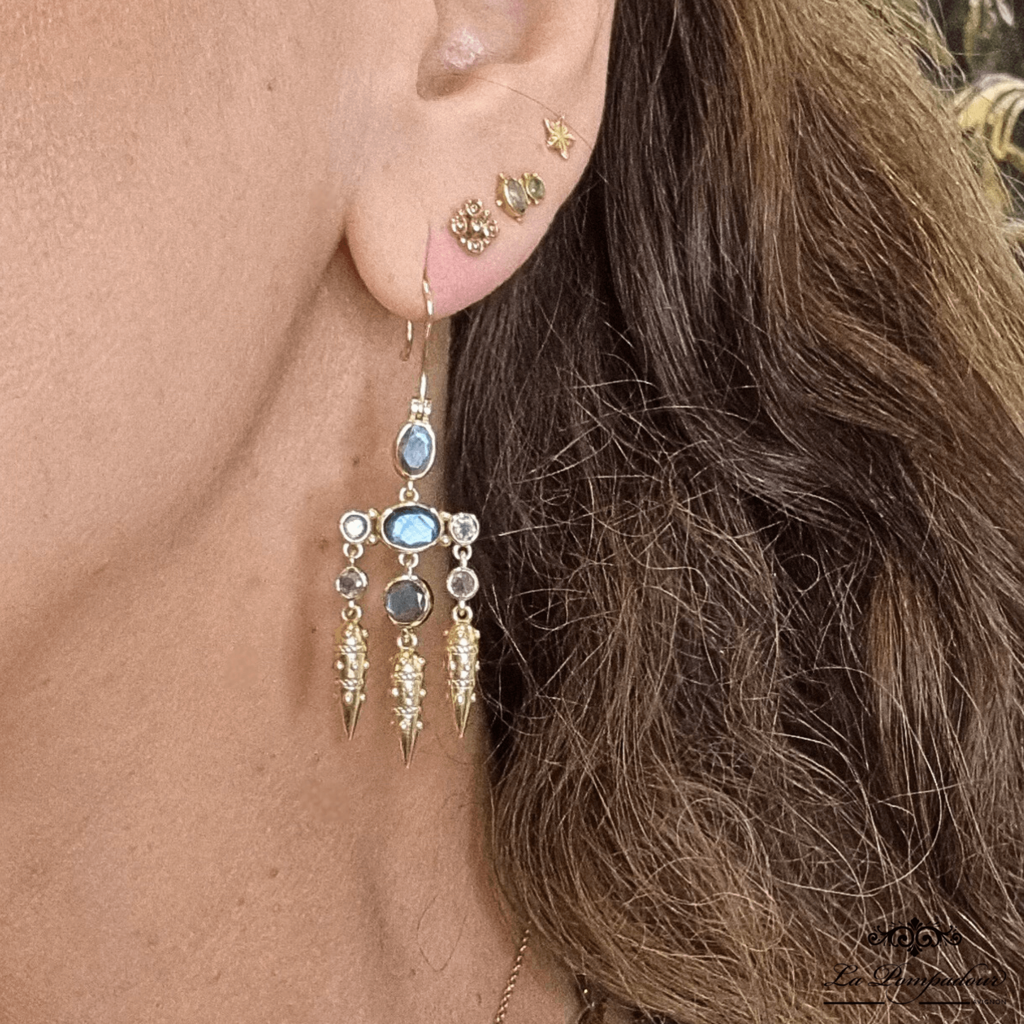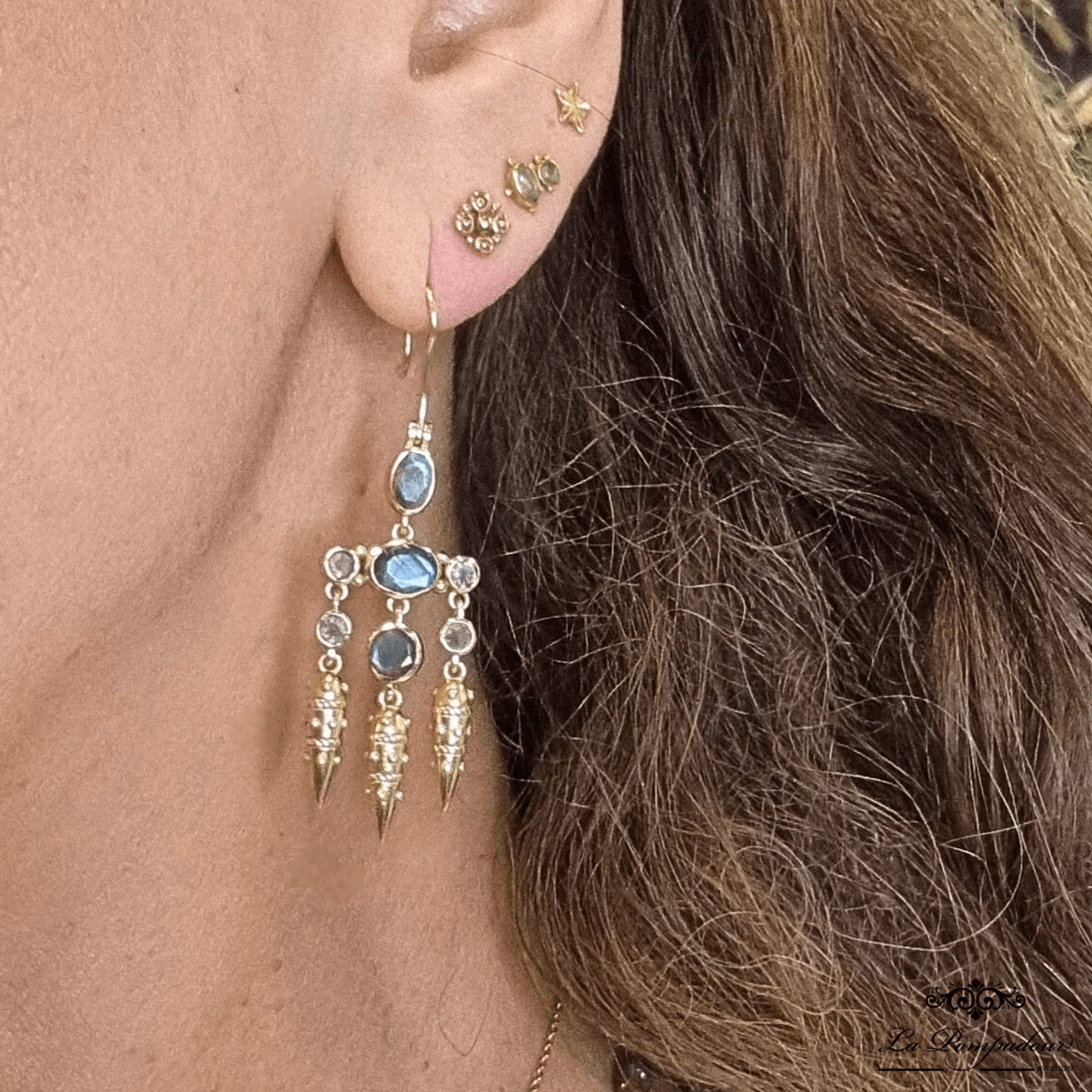 Coup de coeur pour ces boucles d’oreilles très mobiles qui bougent avec vous et dont les labradorites jouent avec la lumière et leurs reflets irisés. Les petits pendants apportent la touche de caractère
