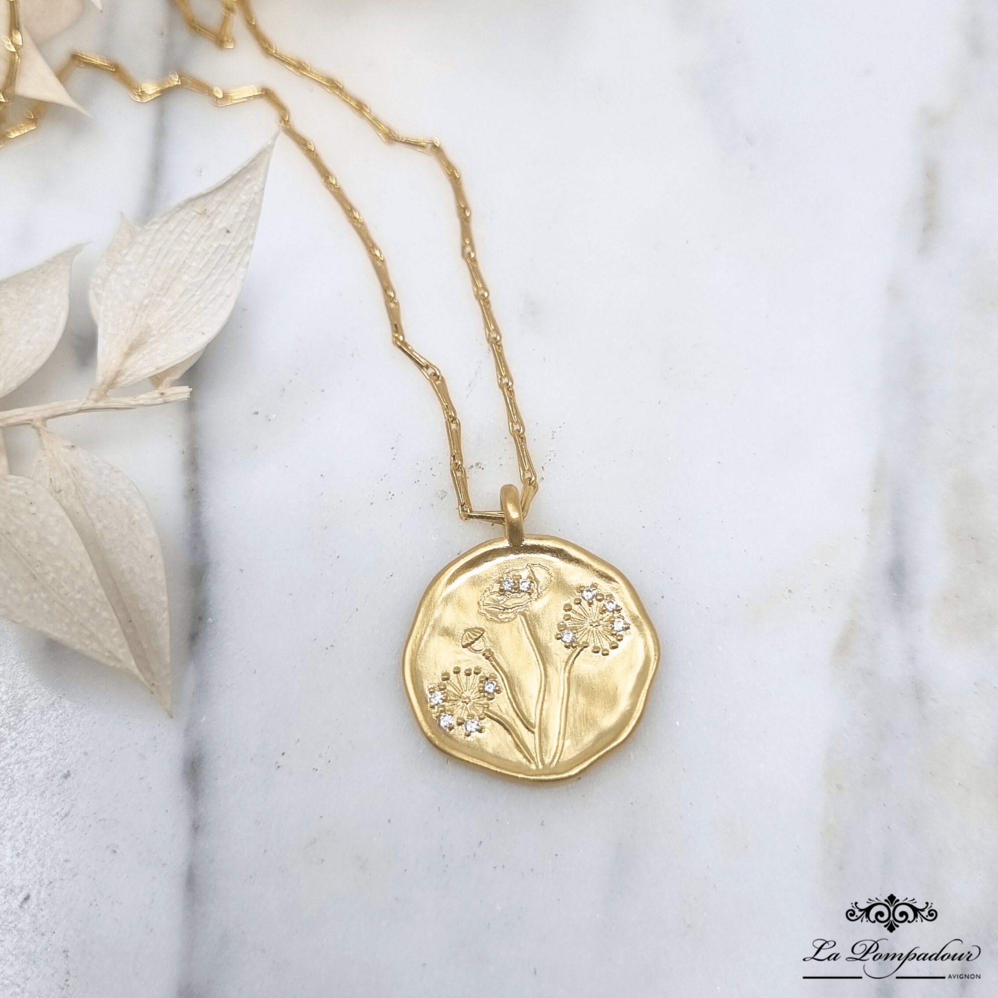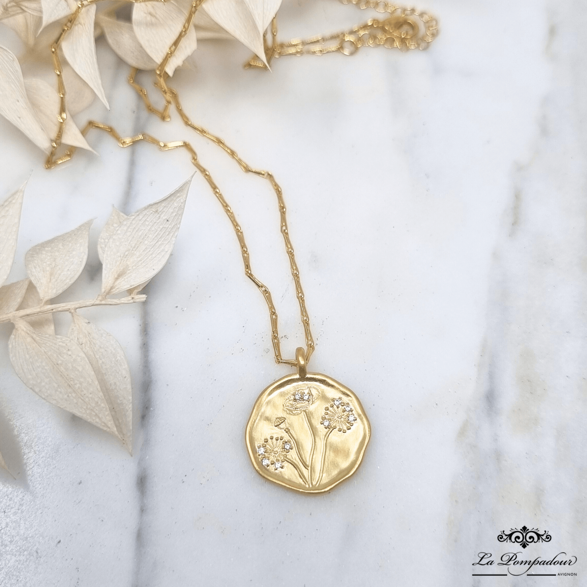 Médaille décorée de deux fleurs de pissenlit et un coquelicot. Les fleurs sont ornées de dix zircons blancs sertis qui ajoutent cet éclat comme une rosée matinale. Un collier au charme élégant, poétique et intemporel
