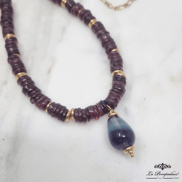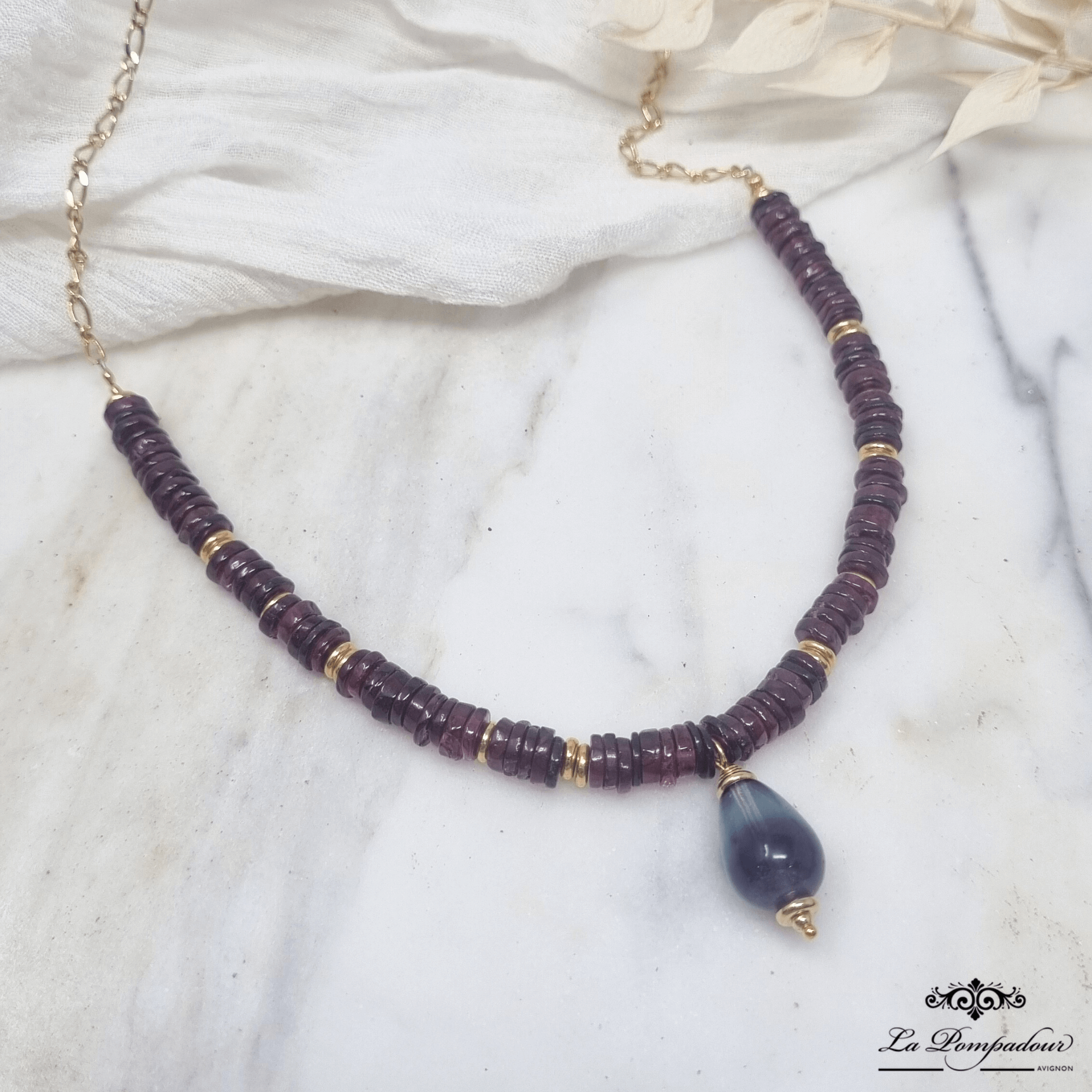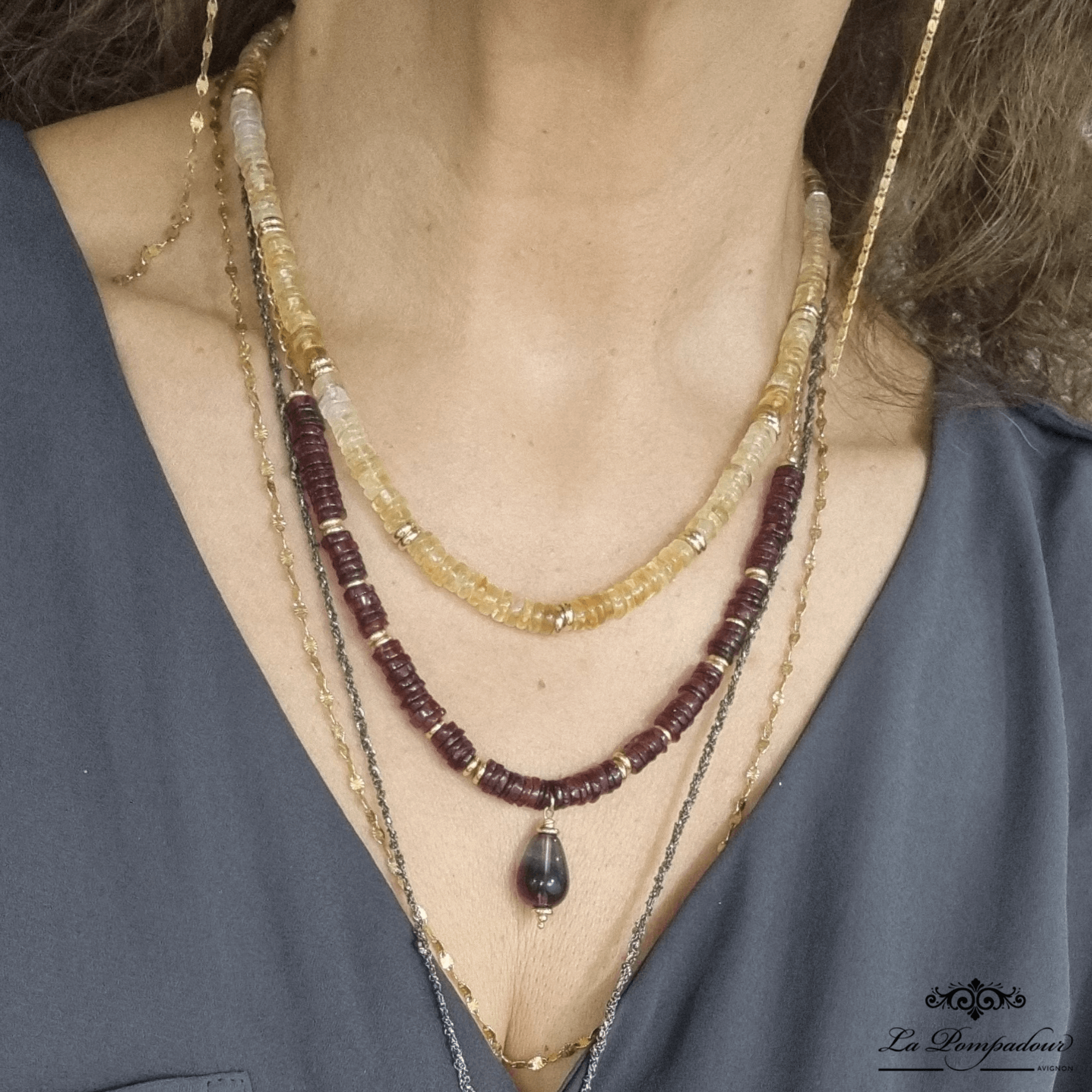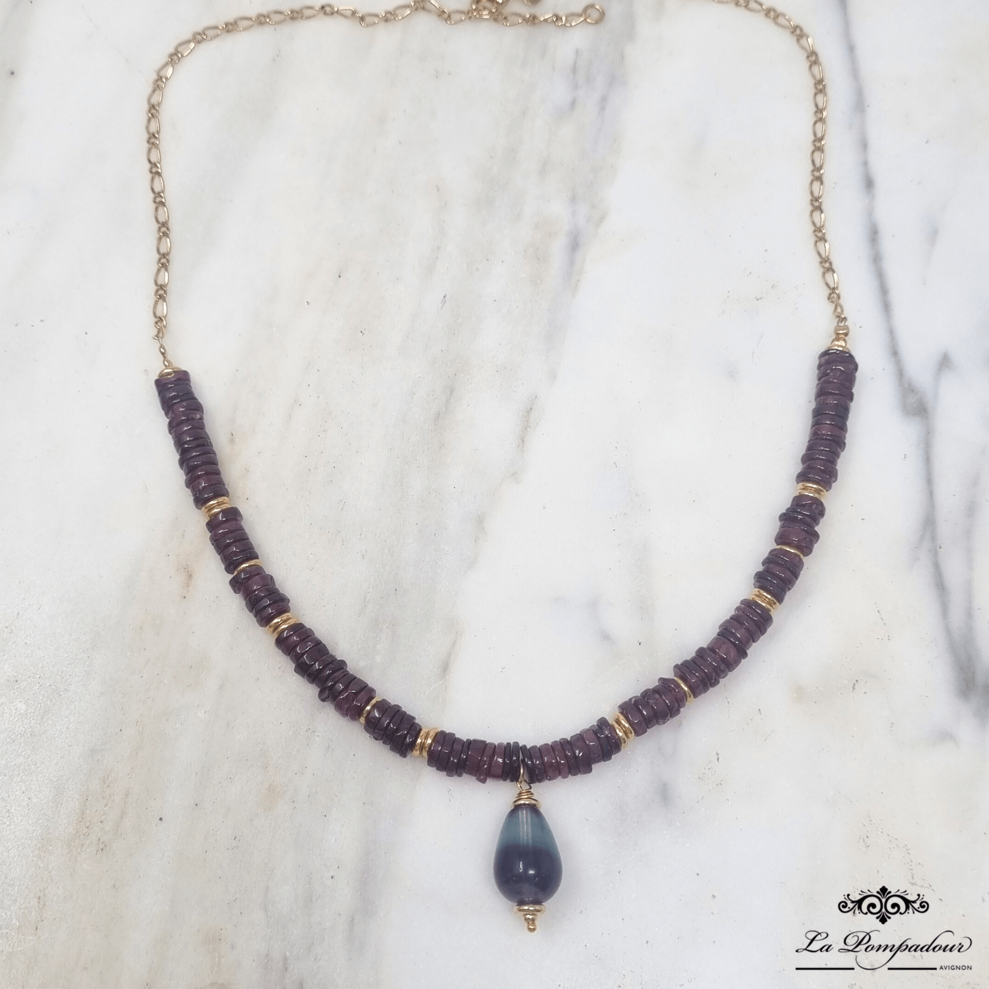 Superbe collier composé de grenats, pendentif goutte fluorite, éléments et chaine en plaqué or 3 microns